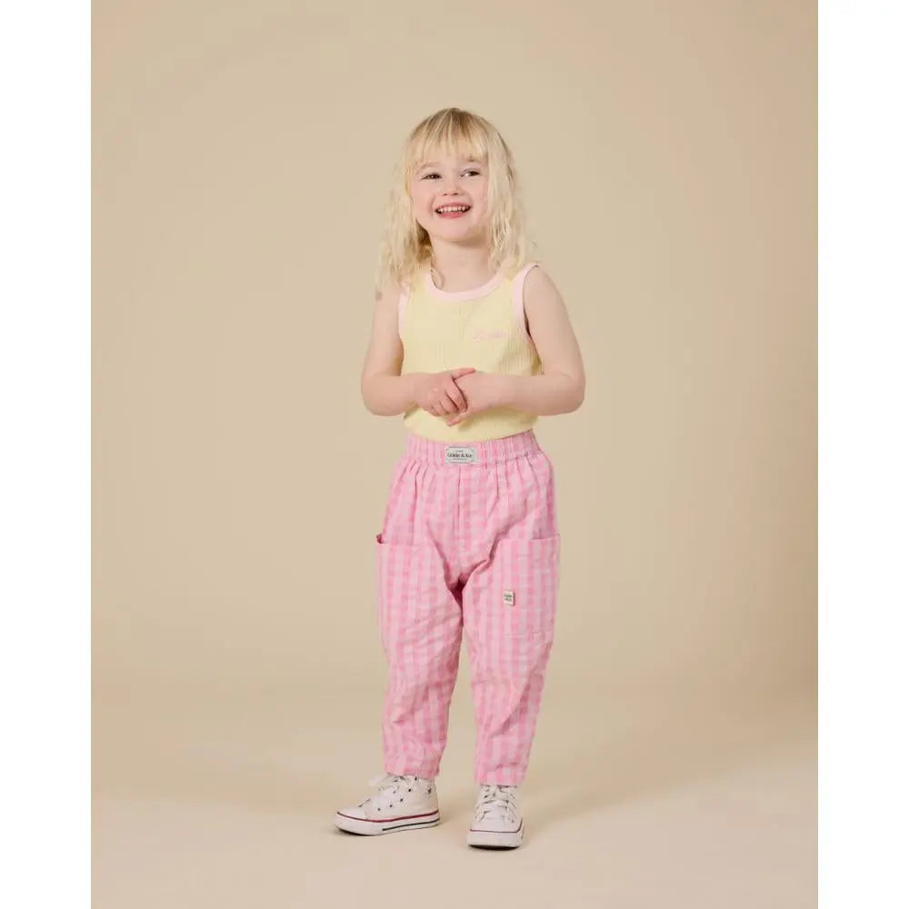 The Kid Lightweight Gingham Kit Pocket Pant in Pink by Giggles LA is crafted from lightweight woven fabric made from 100% cotton. Designed for comfort and everyday wear, these pants feature an elasticated waist with an internal drawcord and functional pockets. Perfect for warm-weather days, playtime, and effortless styling. Designed in Australia.